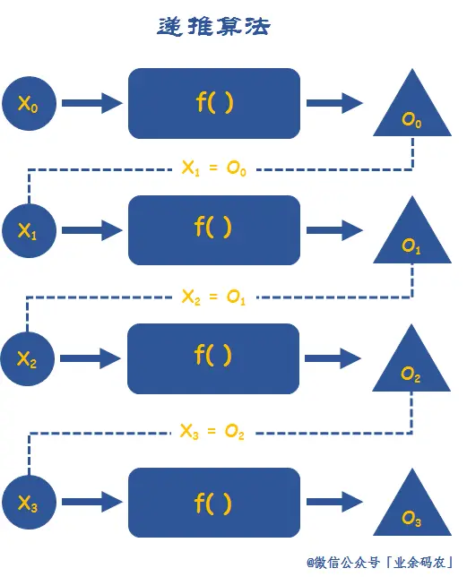 递推思想用图解来表示可以参见下图。每一次推导的结果可以作为下一次推导的的开始,这似乎跟迭代、递归的思想有点类似,不过递推的范畴要更广一些。