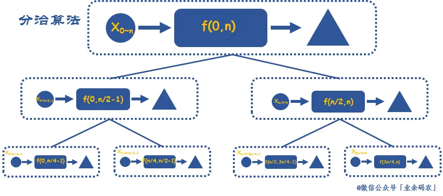 分治思想的图解可见下图。通过层层粒度上的划分,将原问题划分为最小的子问题,然后再向上依次得到更高粒度的解。从上而下,再从下而上。先分解,再求解,再合并。