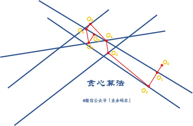 这个图表示的是求解对多条直线的交点。很显然,下图中的直线是不存在统一交点的,但是可以通过算法求得统一交点的最优解。若是采用贪心算法,那么在进行迭代时,每一次都会选择离此时位置最近的直线进行更新。这样一来,在经过多次迭代治后,交点的位置就会在某一片区域无限轮回跳转。而这片区域也就是能求得出的大致的最优解区域。