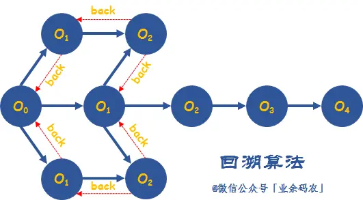 比方说,O0节点前进的路径有三条,分别是上中下条的O1。回溯过程的开始,先走上面的O1,然后能够到达上面 O2,但是这时是一条死路。那么就需要从O2退回到O1,而此时O1的唯一选择也走不通,所以还需要从O1退回到O0。然后继续试探中间的O1。