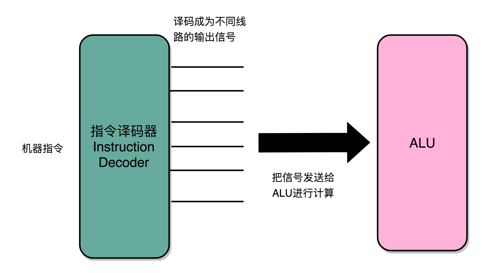 指令译码器将输入的机器码,解析成不同的操作码和操作数,然后传输给 ALU 进行计算。