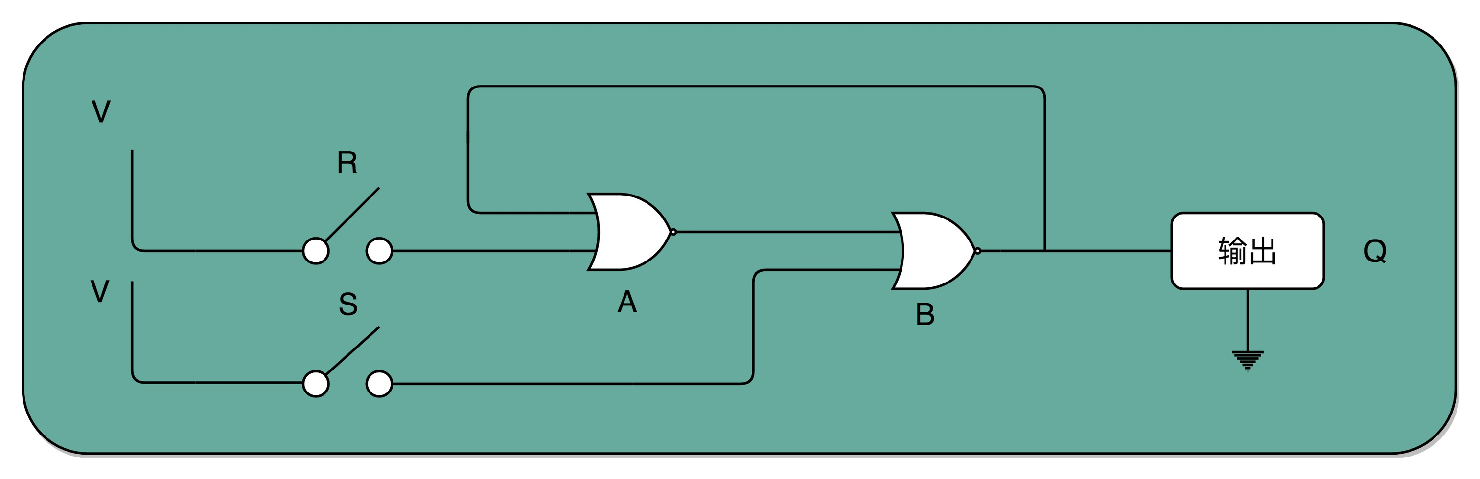 接通开关 R,输出变为 1,即使断开开关,输出还是 1 不变。接通开关 S,输出变为 0,即使断开开关,输出也还是 0。也就是,当两个开关都断开的时候,最终的输出结果,取决于之前动作的输出结果,这个也就是我们说的记忆功能。 其中当两个开关都为 0 的时候,对应的输出不是 1 或者 0,而是和 Q 的上一个状态一致。