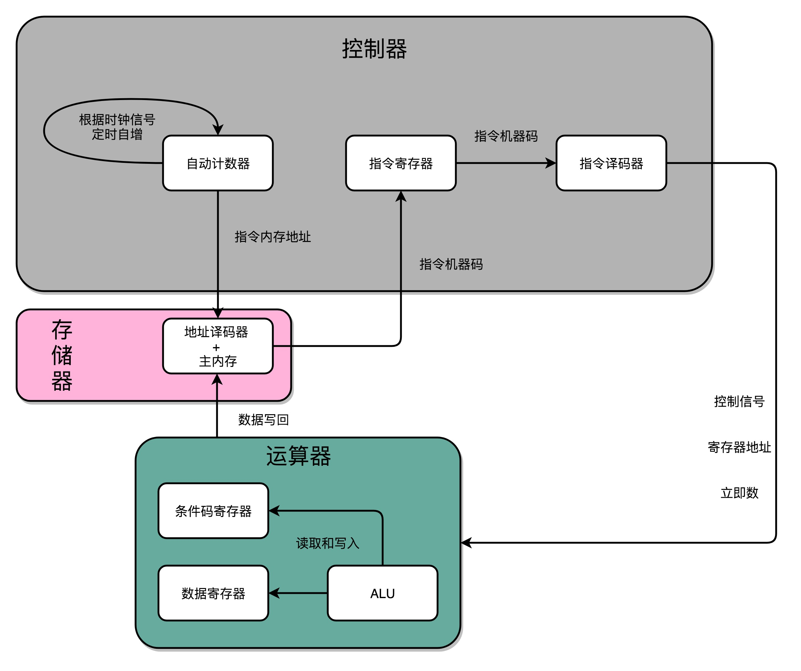 - 控制器:通过 PC 寄存器和指令寄存器取出指令的过,是由控制器操作的。指令的解码过程,也是由控制器进行的。