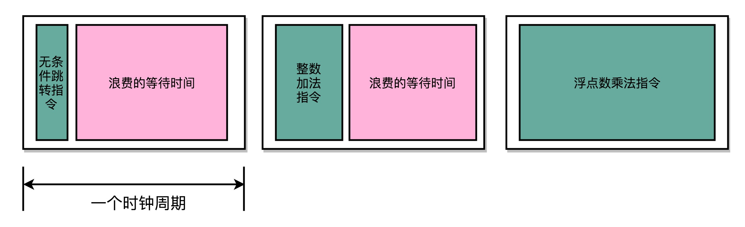 不同指令的执行时间不同,随着门电路层数的增加,由于门延迟的存在,位数多、计算复杂的指令需要的执行时间会更长。但是我们需要让所有指令都在一个时钟周期内完成,如单指令周期处理器那样,那就只好把时钟周期和执行时间最长的那个指令设成一样。也就意味着快速执行完成的指令,需要等待满一个时钟周期,才能执行下一条指令,如图: