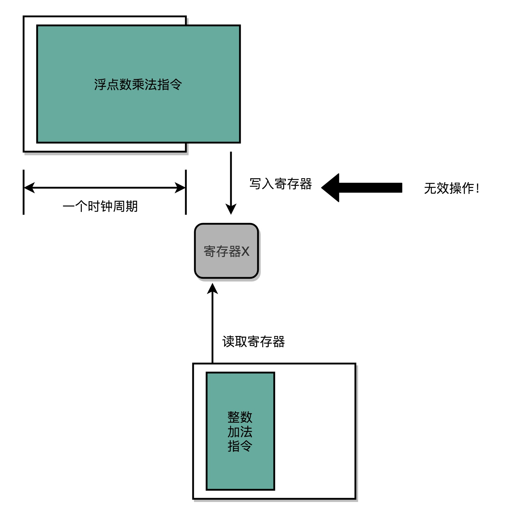 由此因为复杂指令执行时间的制约,处理器的时钟频率就没法太高。因为太高的话,有些复杂指令没有办法在一个时钟周期内运行完成。那么在下一个时钟周期到来,开始执行下一条指令的时候,前一条指令的执行结果可能还没有写入到寄存器里面。那下一条指令读取的数据就是不准确的,就会出现错误。 如图,超时写入即无效,这次改动相当于丢失了。