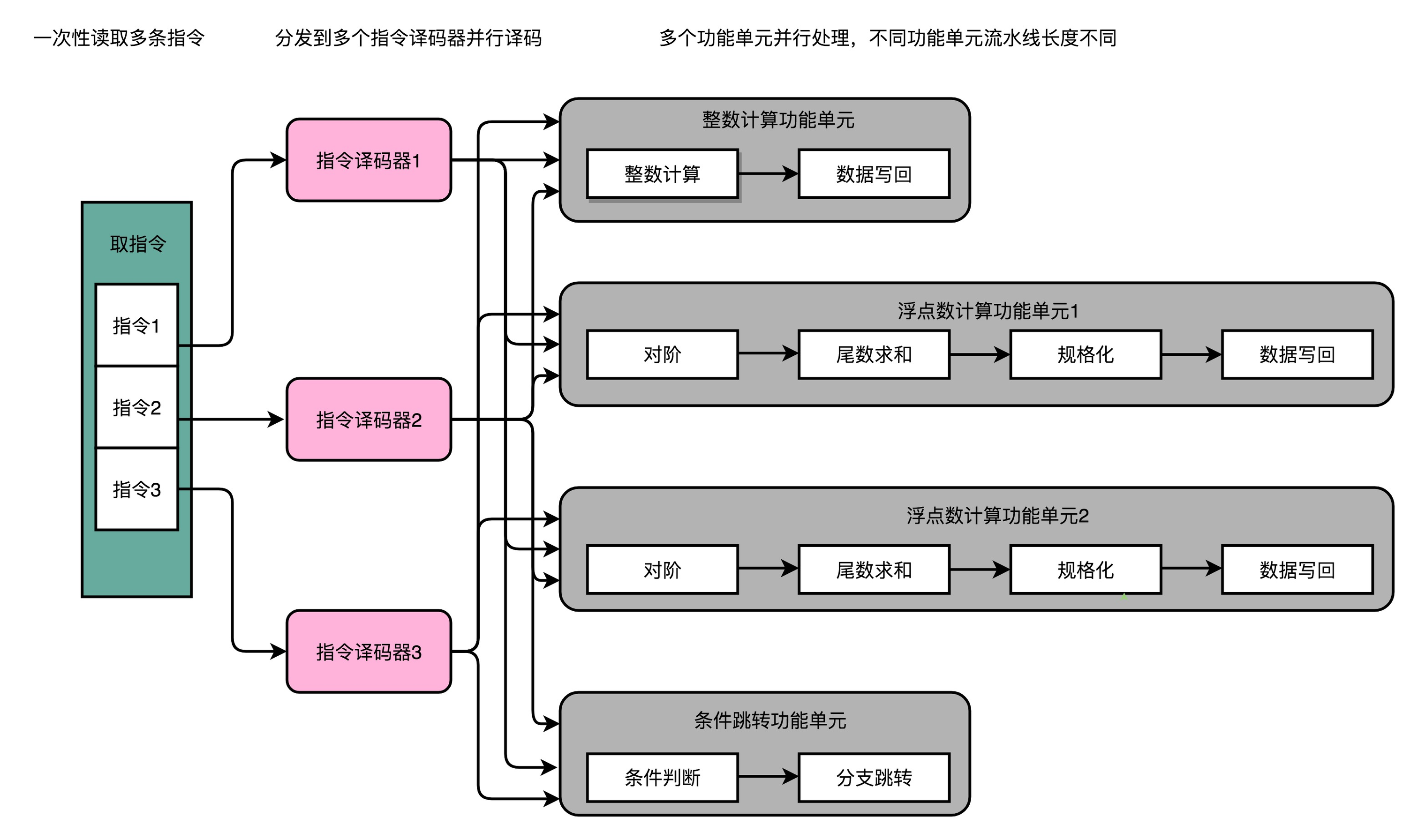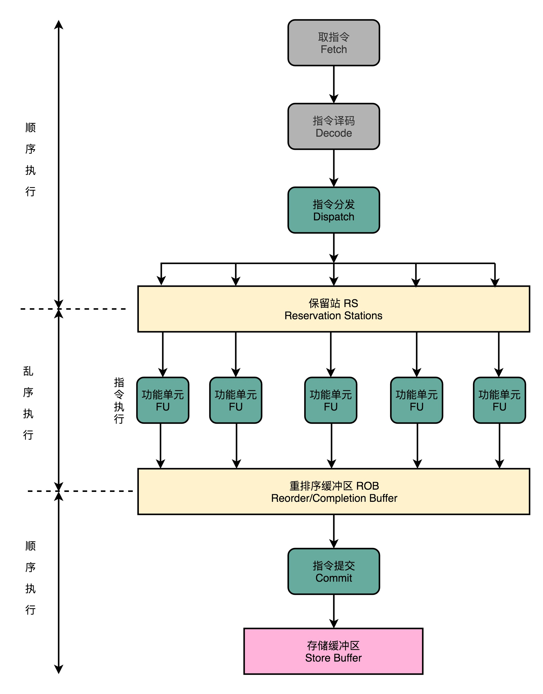 这些 RISC 风格的微指令,会被放到一个微指令缓冲区里面,然后再从缓冲区里面,分发给到后面的超标量,并且是乱序执行的流水线架构里面。不过这个流水线架构里面接受的,就不是复杂的指令,而是精简的指令了。在这个架构里,我们的指令译码器相当于变成了设计模式里的一个“适配器”。这个适配器,填平了 CISC 和 RISC 之间的指令差异。但是这样的译码器,意味着需要更复杂的电路和更长的译码时间,通过 RISC 提升的性能又被译码器花费了。