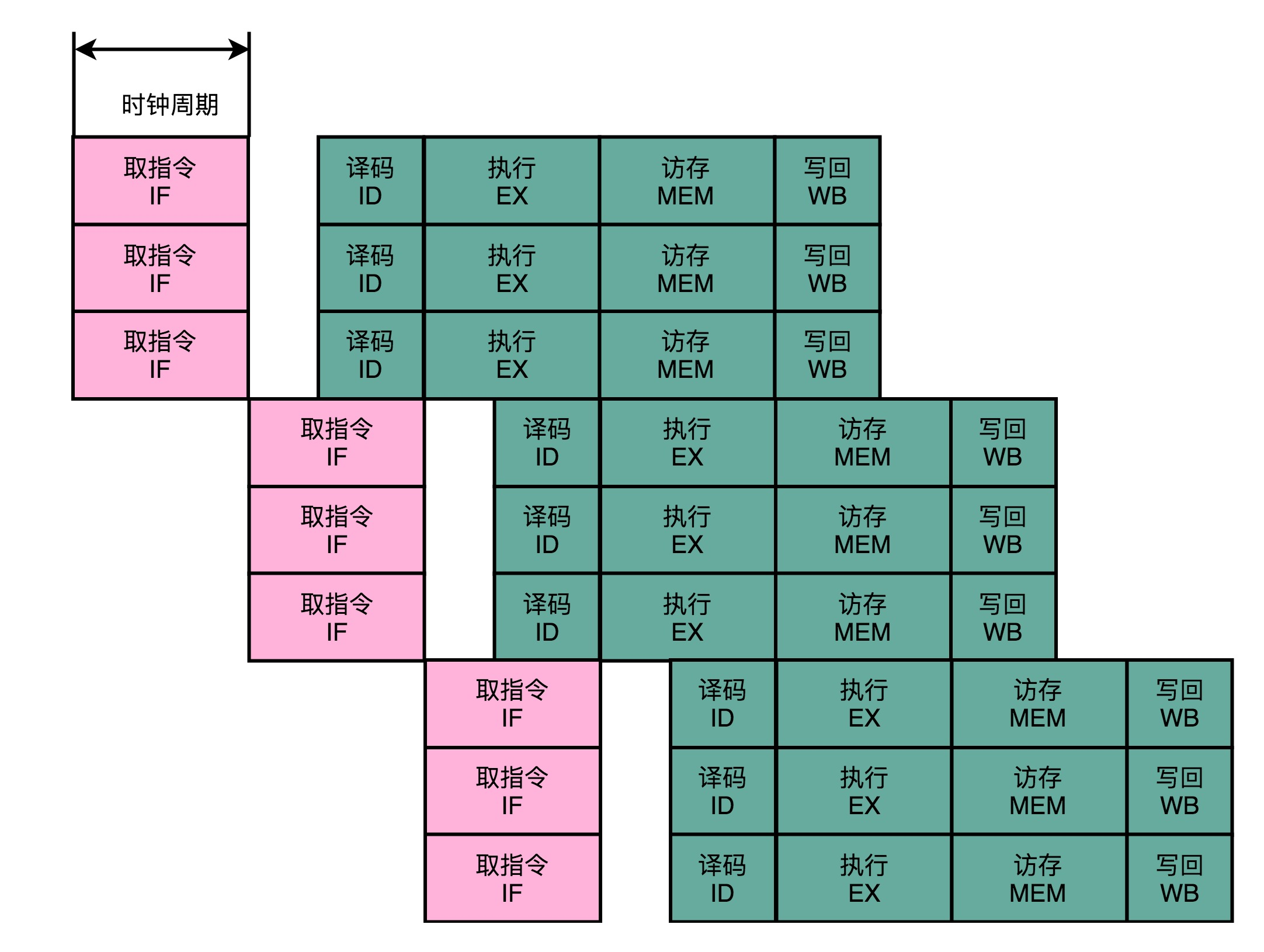 这样一来,就不用把时钟周期设置成整条指令执行的时间,而是拆分成完成这样的一个一个小步骤需要的时间。同时,每一个阶段的电路在完成对应的任务之后,也不需要等待整个指令执行完成,而是可以直接执行下一条指令的对应阶段。