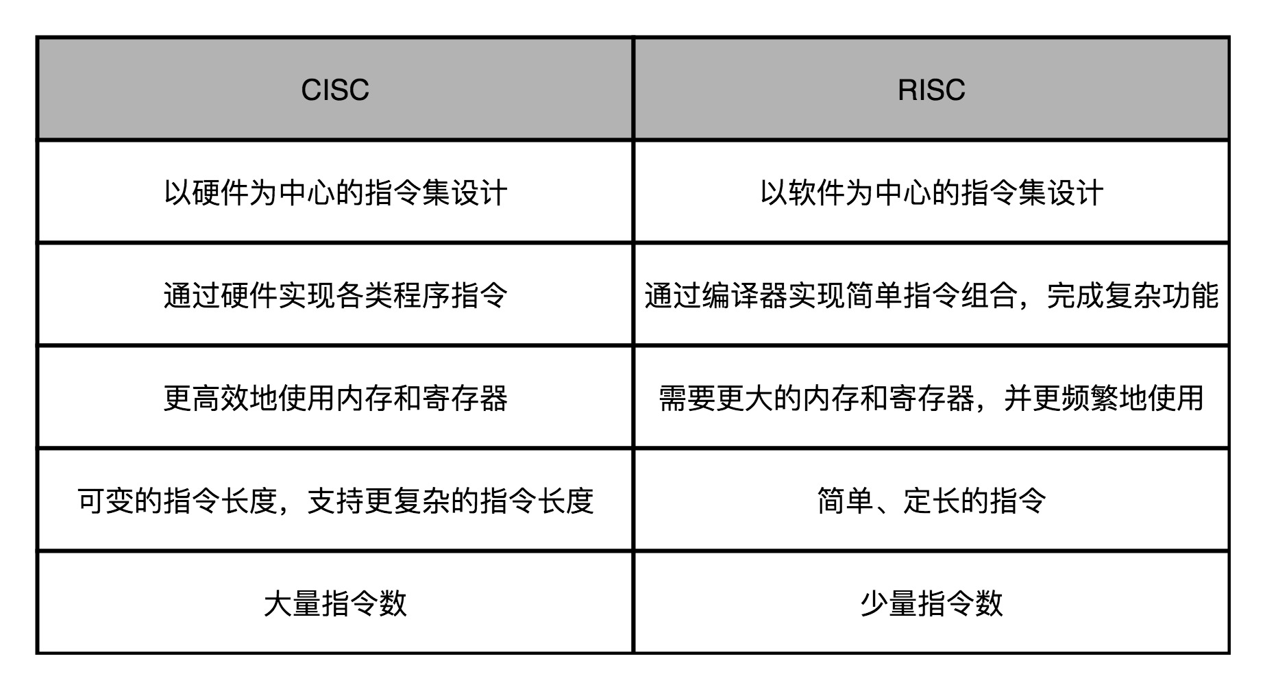 RISC 的指令是固定长度的,CISC 的指令是可变长度的。RISC 的指令集里的指令数少,而且单个指令只完成简单的功能,所以被称为“精简”。CISC 里的指令数多,为了节约内存,直接在硬件层面能够完成复杂的功能,所以被称为“复杂”。RISC 的通过减少 CPI 来提升性能,而 CISC 通过减少需要的指令数来提升性能。