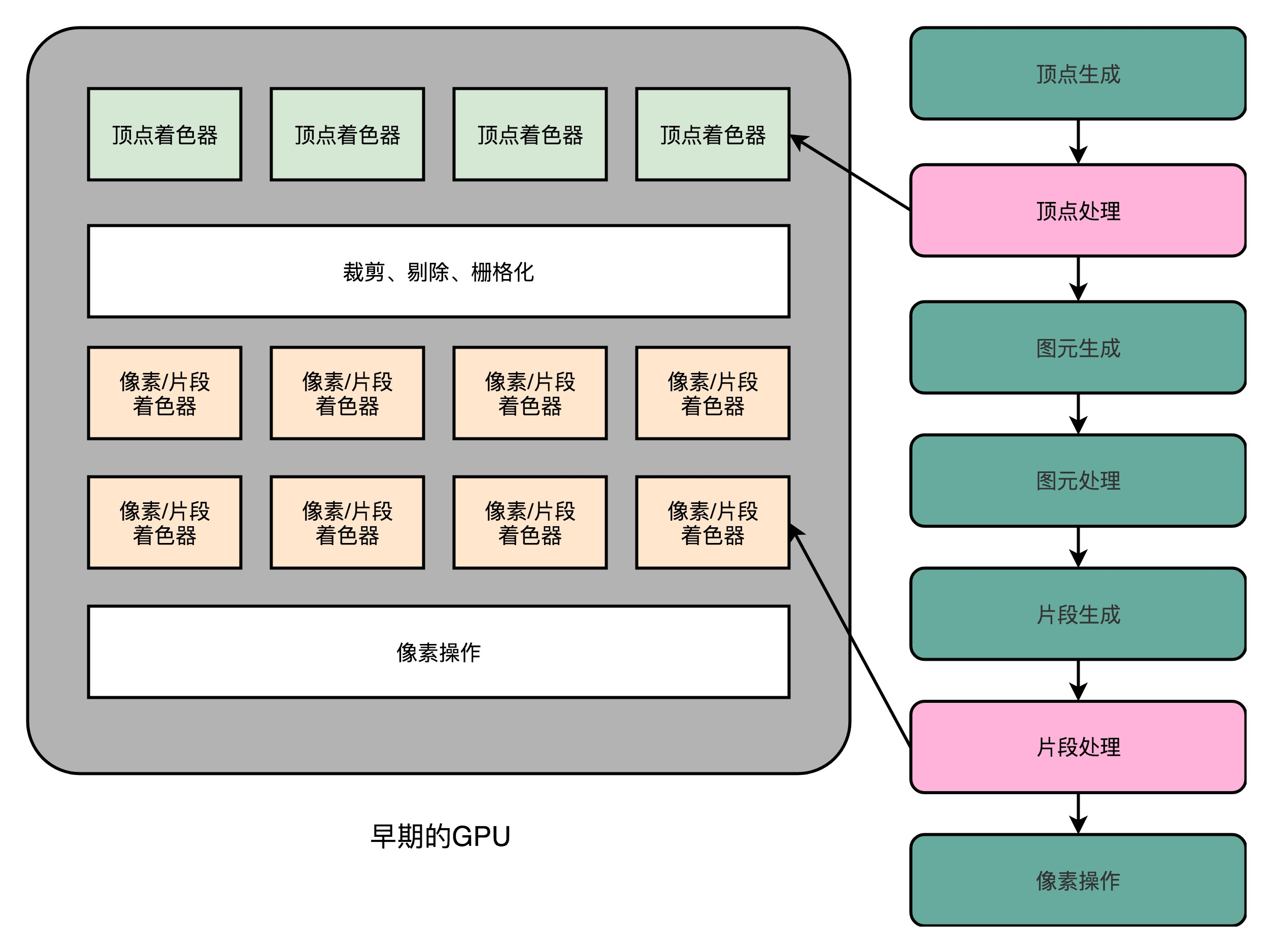 因为整个图形渲染过程都是在硬件里面固定的管线来完成的。程序员们过去在加速卡上能做的事情呢,只有改配置来实现不同的图形渲染效果。如果通过改配置做不到,就没有什么办法了。