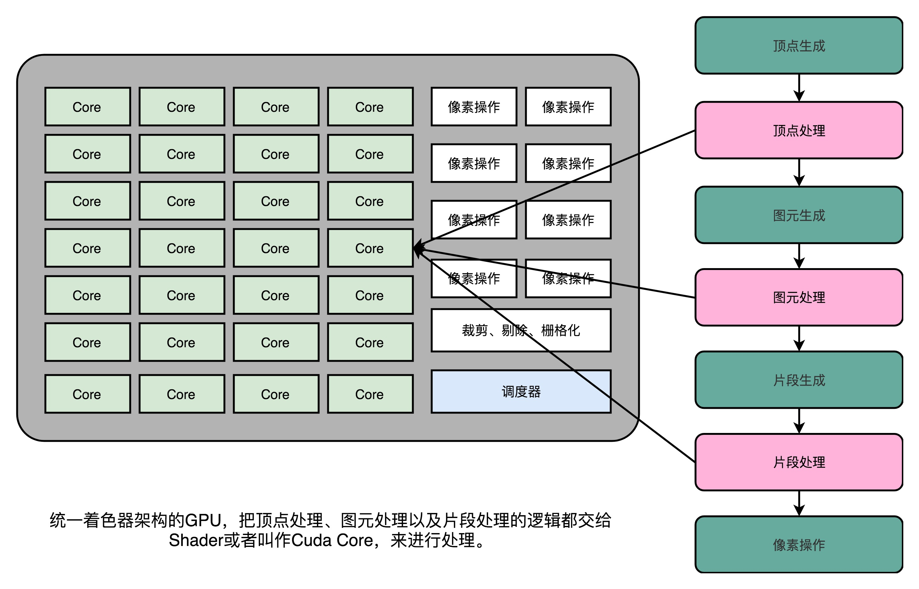 因为用的指令集是一样的,所以就在 GPU 里面放很多个一样的 Shader 硬件电路,然后通过统一调度,把顶点处理、图元处理、片段处理这些任务,都交给这些 Shader 去处理,让整个 GPU 尽可能地忙起来。这样的设计,就是我们现代 GPU 的设计,就是统一着色器架构。这个时候的“着色器”的作用,其实已经和它的名字关系不大了,而是变成了一个通用的抽象计算模块的名字。