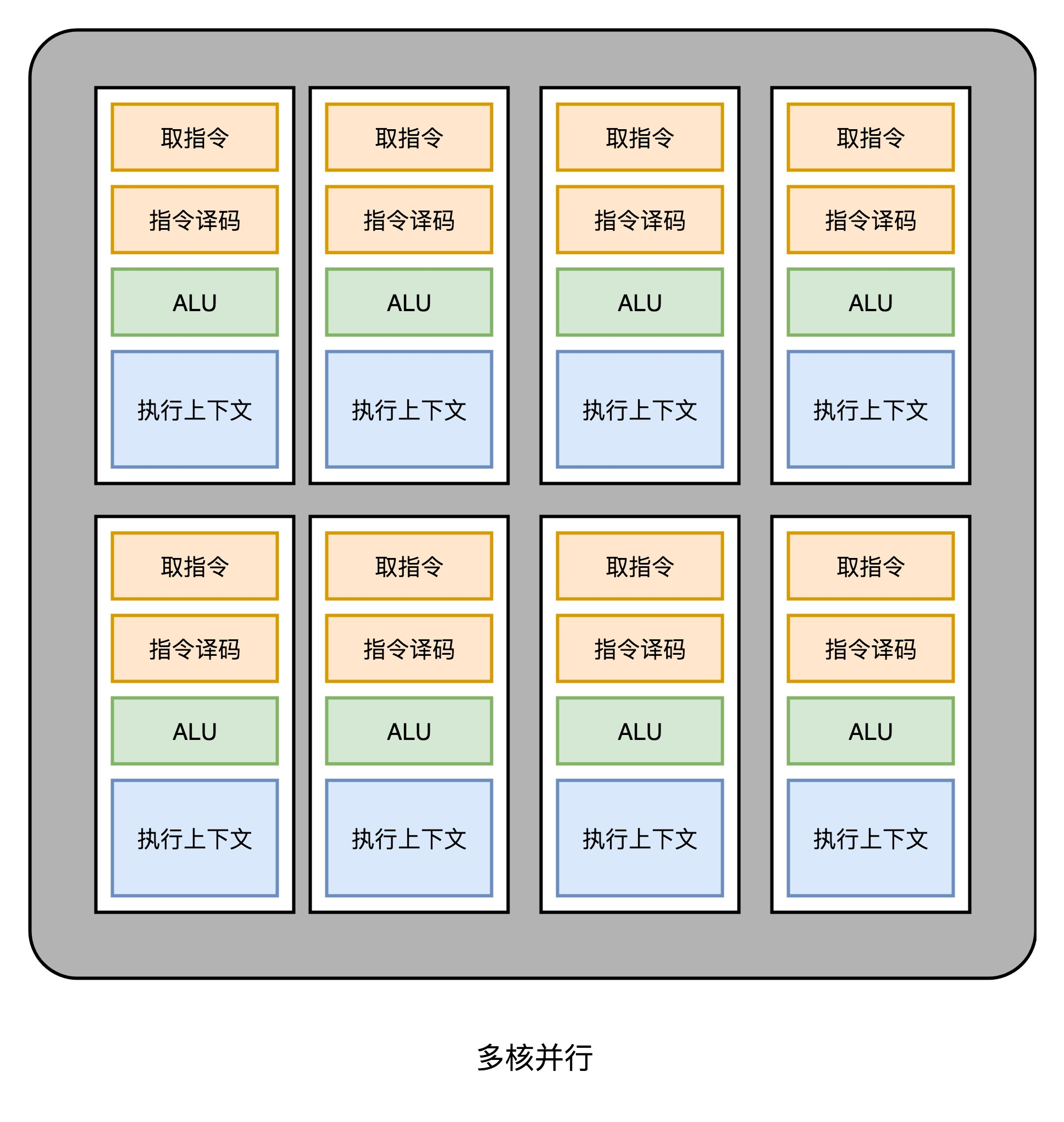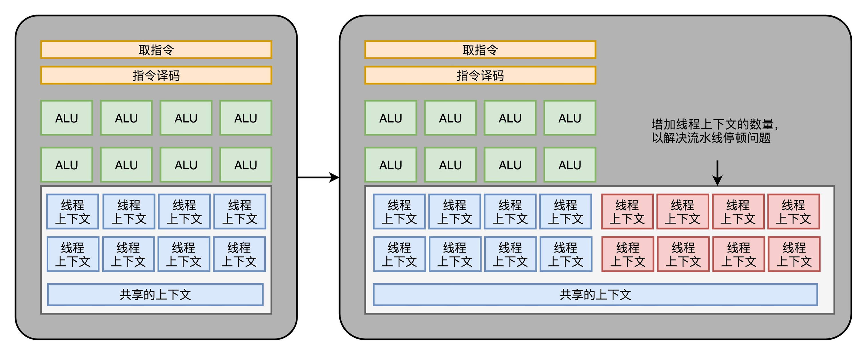 和超线程一样,既然要调度一个不同的任务过来,我们就需要针对这个任务,提供更多的执行上下文。所以,一个 Core 里面的执行上下文的数量,需要比 ALU 多。