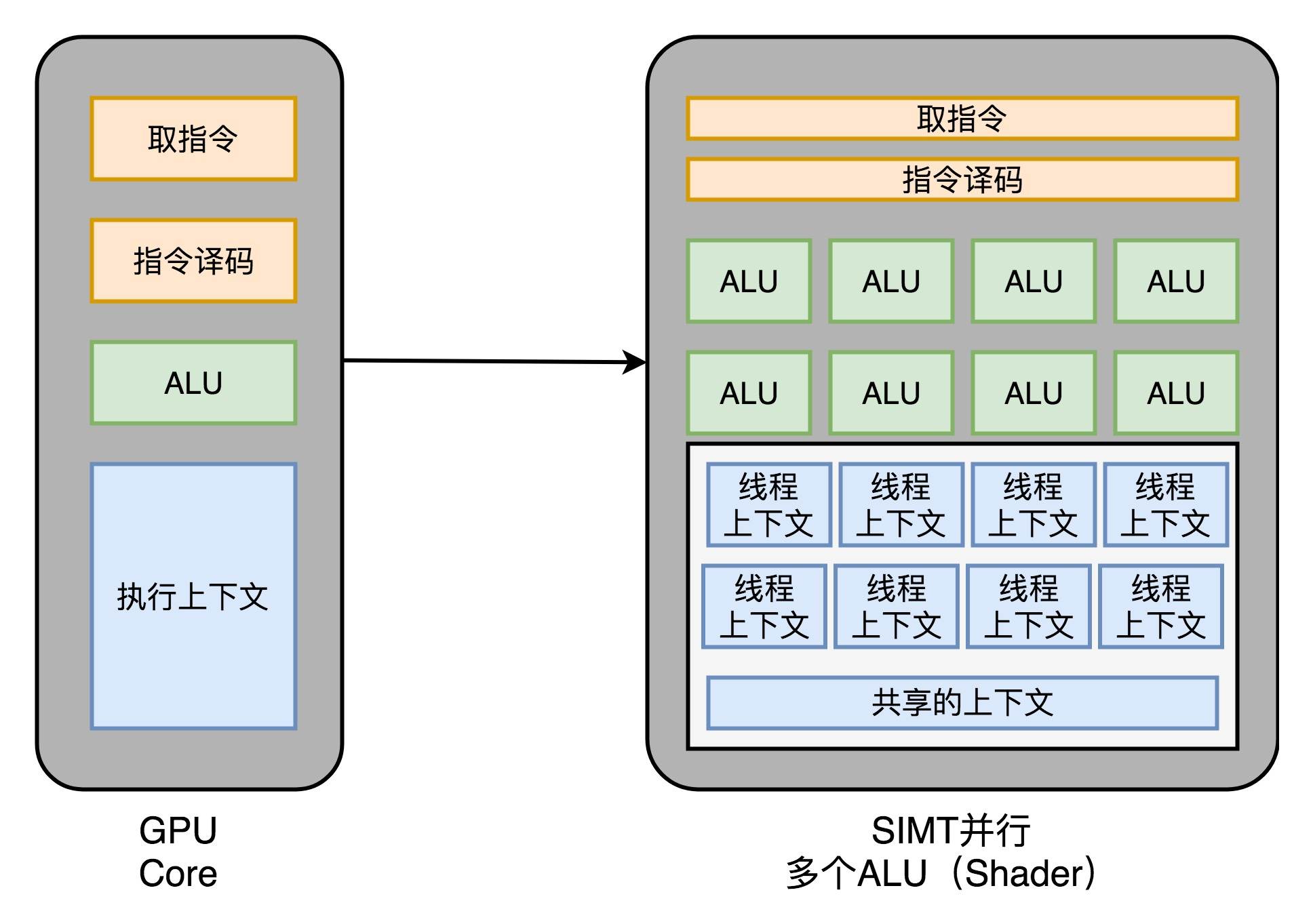 而在 GPU 里,这些电路就显得有点多余了,GPU 的整个处理过程是一个流式处理的过程,因为没有那么多分支条件,或者复杂的依赖关系,我们可以把 GPU 里这些对应的电路都可以去掉,做一次小小的瘦身,只留下取指令、指令译码、ALU 以及执行这些计算需要的寄存器和缓存就好了。一般来说,我们会把这些电路抽象成三个部分,就是下面图里的取指令和指令译码、ALU 和执行上下文。