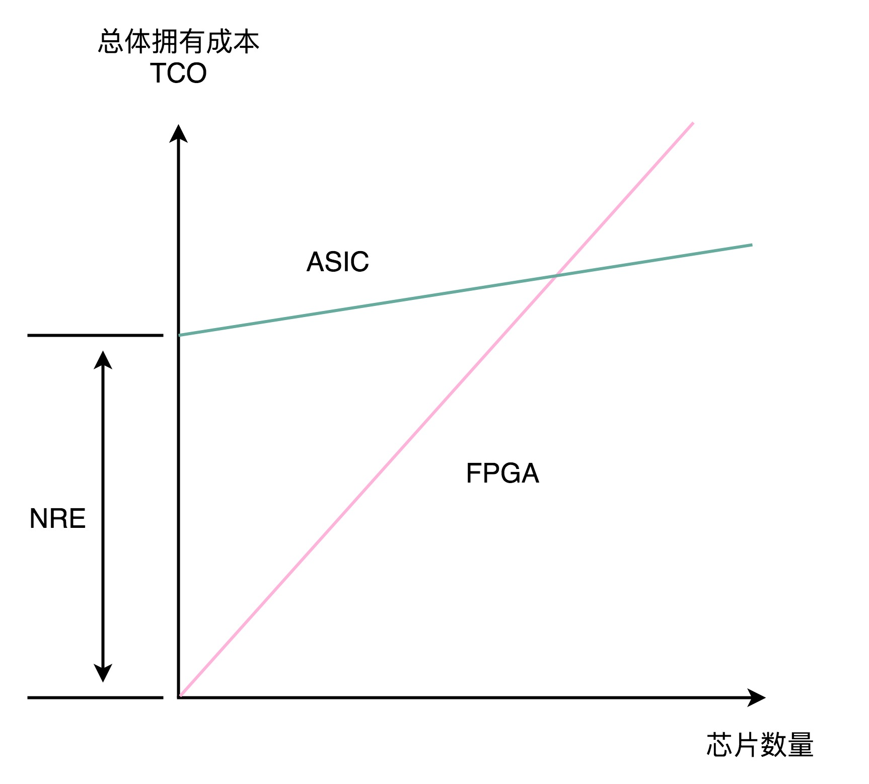 单个 ASIC 的生产制造成本比 FPGA 低,ASIC 的能耗也比能实现同样功能的 FPGA 要低。能耗低,意味着长时间运行这些芯片,所用的电力成本也更低。但是,ASIC 有一笔很高的 NRE(一次性工程费用)成本。这个成本,就是 ASIC 实际“研发”的成本。只有需要大量生产 ASIC 芯片的时候,我们才能摊薄这份研发成本。