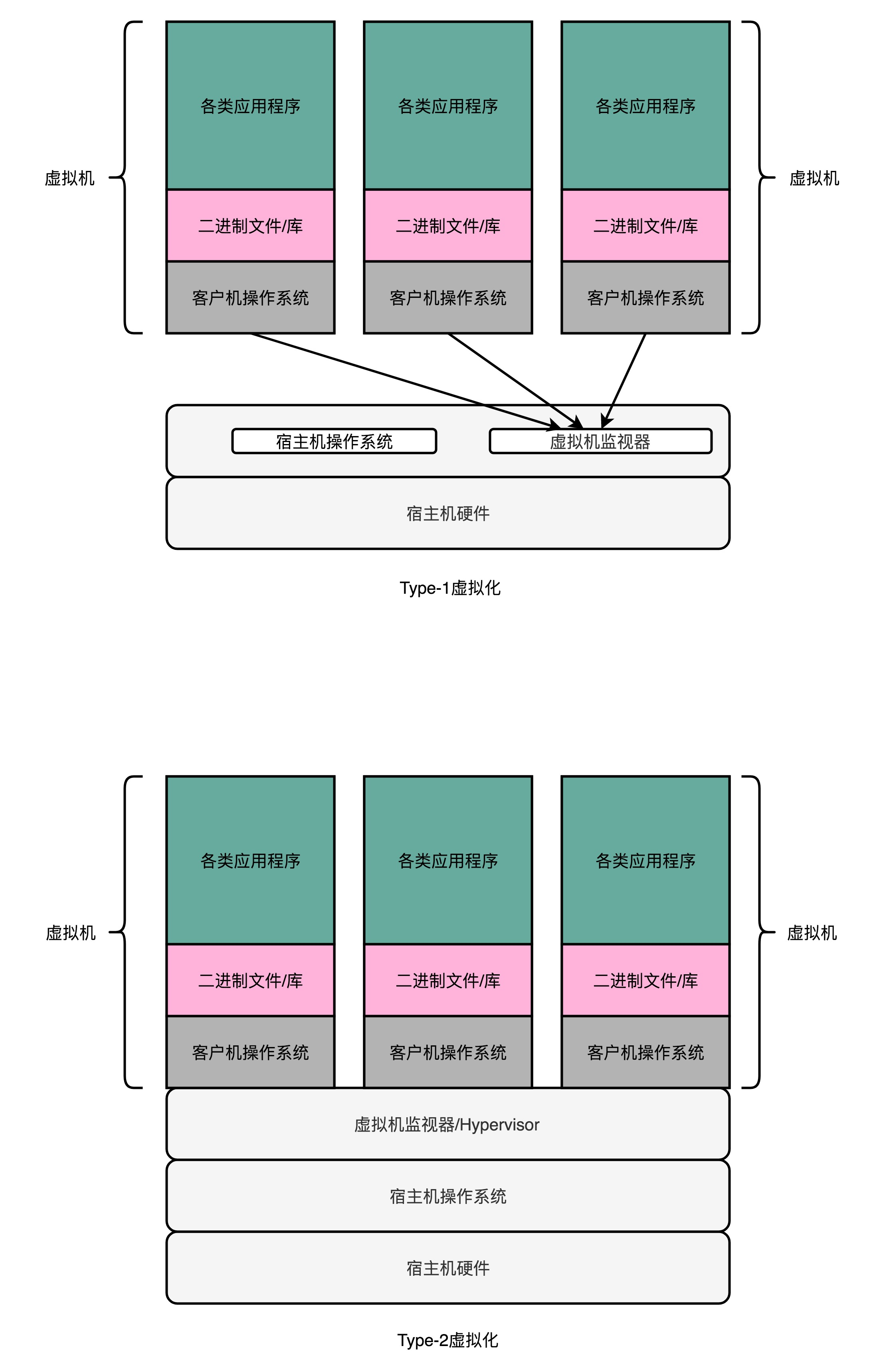 既然指令都是通过虚拟机监视器来执行的,那具体指令是怎么落到硬件上去实际执行的就引申出两种实现方式,分别是 Type-1型虚拟机和Type-2型虚拟机。