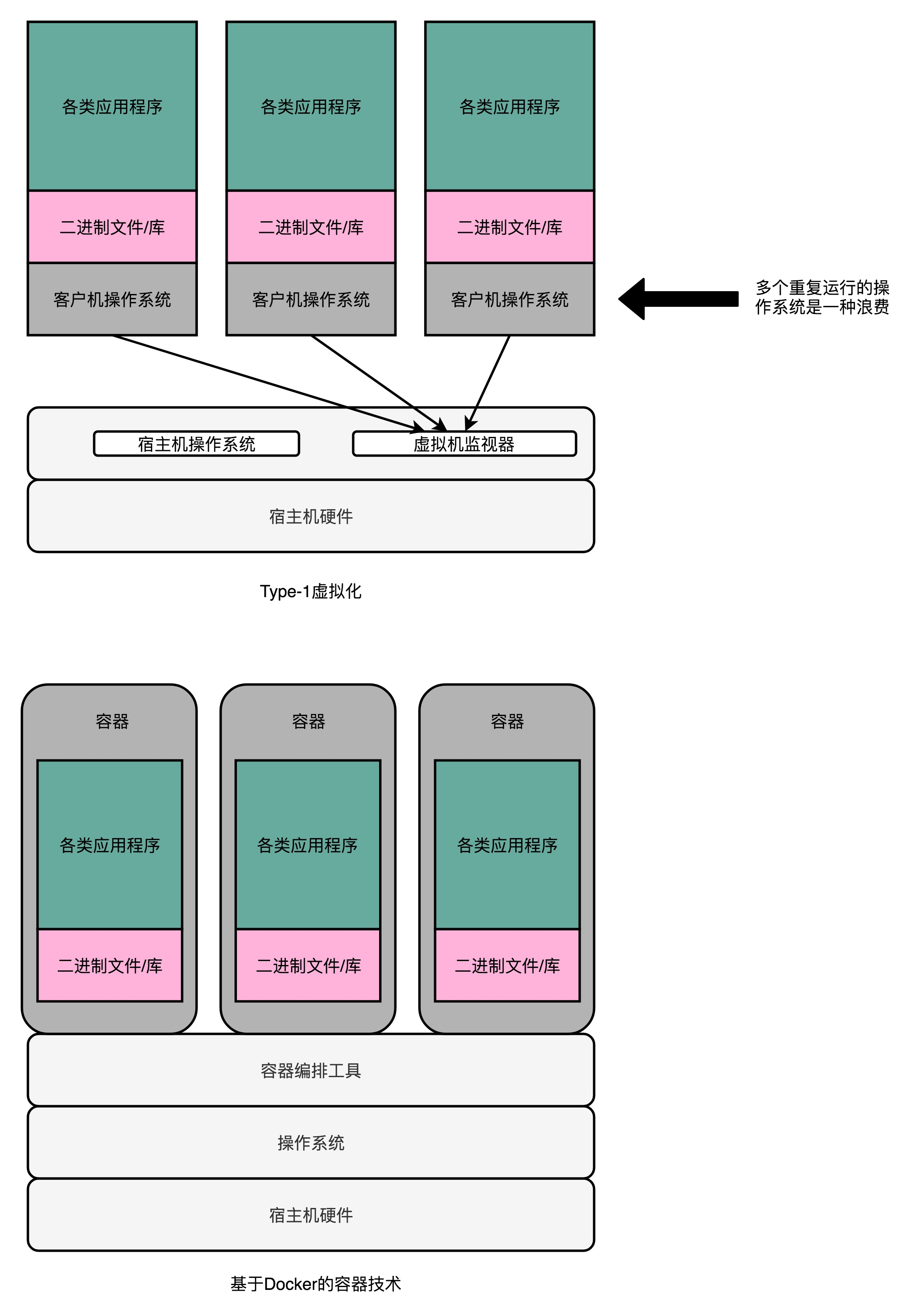 虽然,Type-1 型的虚拟机看起来已经没有什么硬件损耗。但是,这里面还是有一个浪费的资源。在我们实际的物理机上,我们可能同时运行了多个的虚拟机,而这每一个虚拟机,都运行了一个属于自己的单独的操作系统。 多运行一个操作系统,意味着我们要多消耗一些资源在 CPU、内存乃至磁盘空间上。
