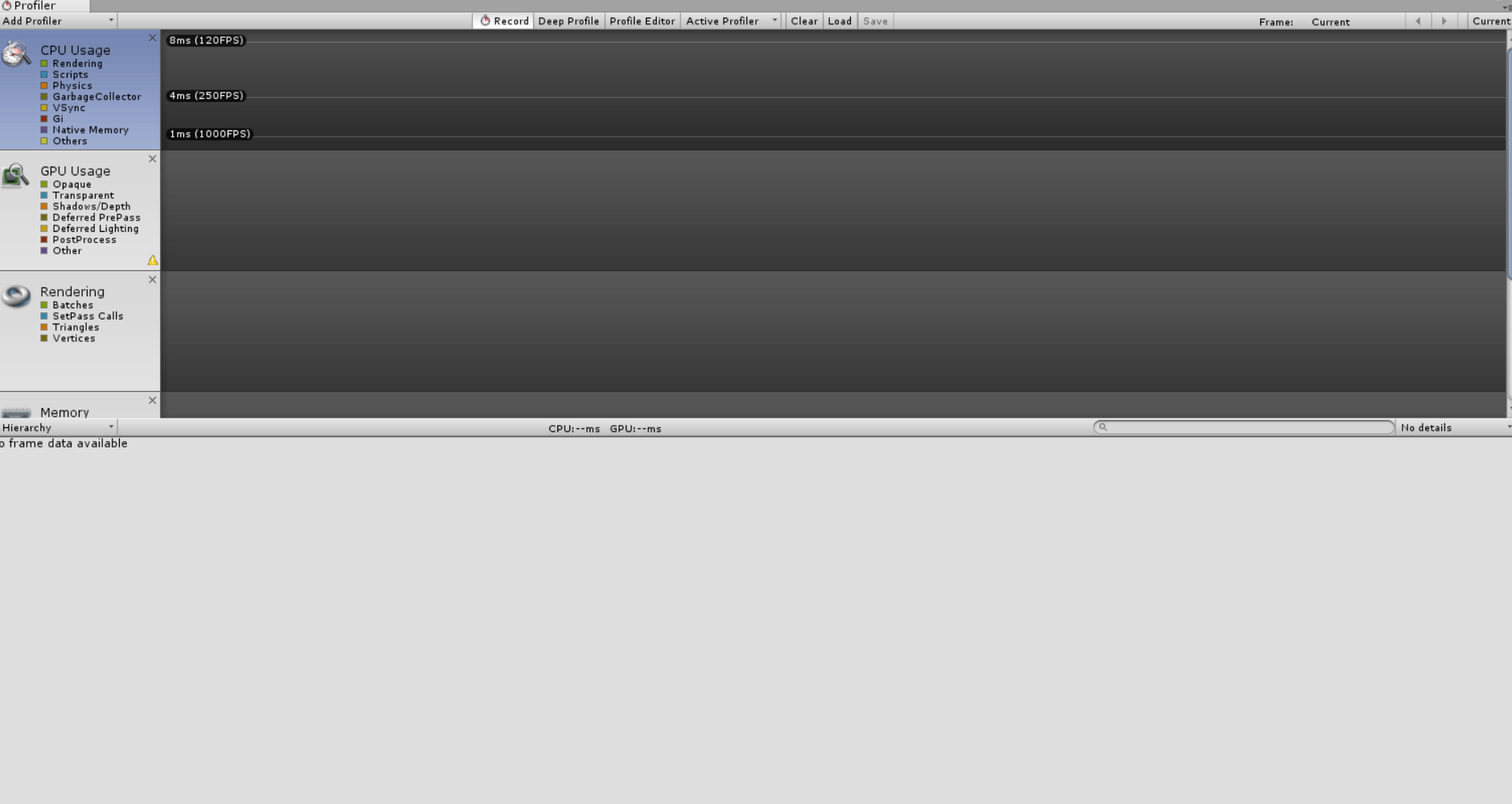 今天给大家带来的是性能优化的”葵花宝典”,哈哈。我们在unity中怎么看自己的项目的性能情况呢?相信很多人都会说,我们看state面板属性进行分析啊!这个地方确实是可以看出一点东西的。但是它只能看个大概,能解决部分问题。也就是治标不治本。那么我们该怎么才能找到我们性能的严重耗损点呢。这个时候我们就需要看Profiler了。它是什么?它是性能分析器(姑且这么叫它),它可以比state更加清晰的看清楚你的项目哪些地方性能消耗严重。怎么打开呢?Window->Profiler,就可以看到了。它主要包含CPU,GPU,Render,内存,声音,视频,网络,物理系统等模块的性能消耗情况。如图: