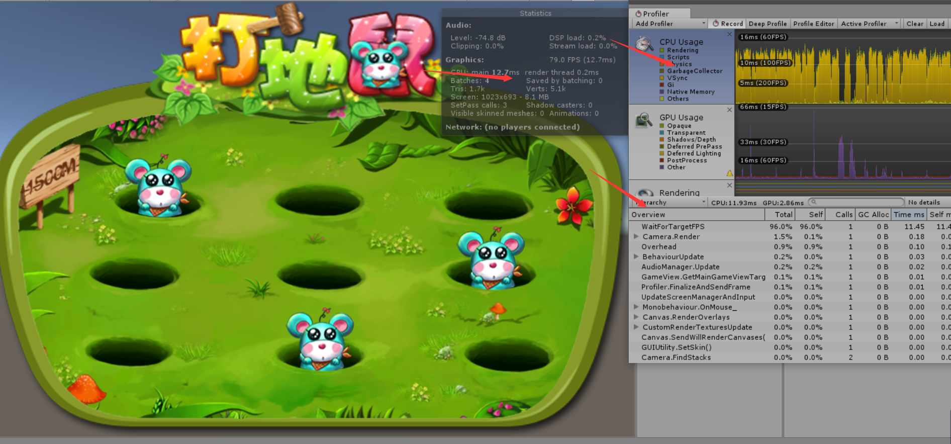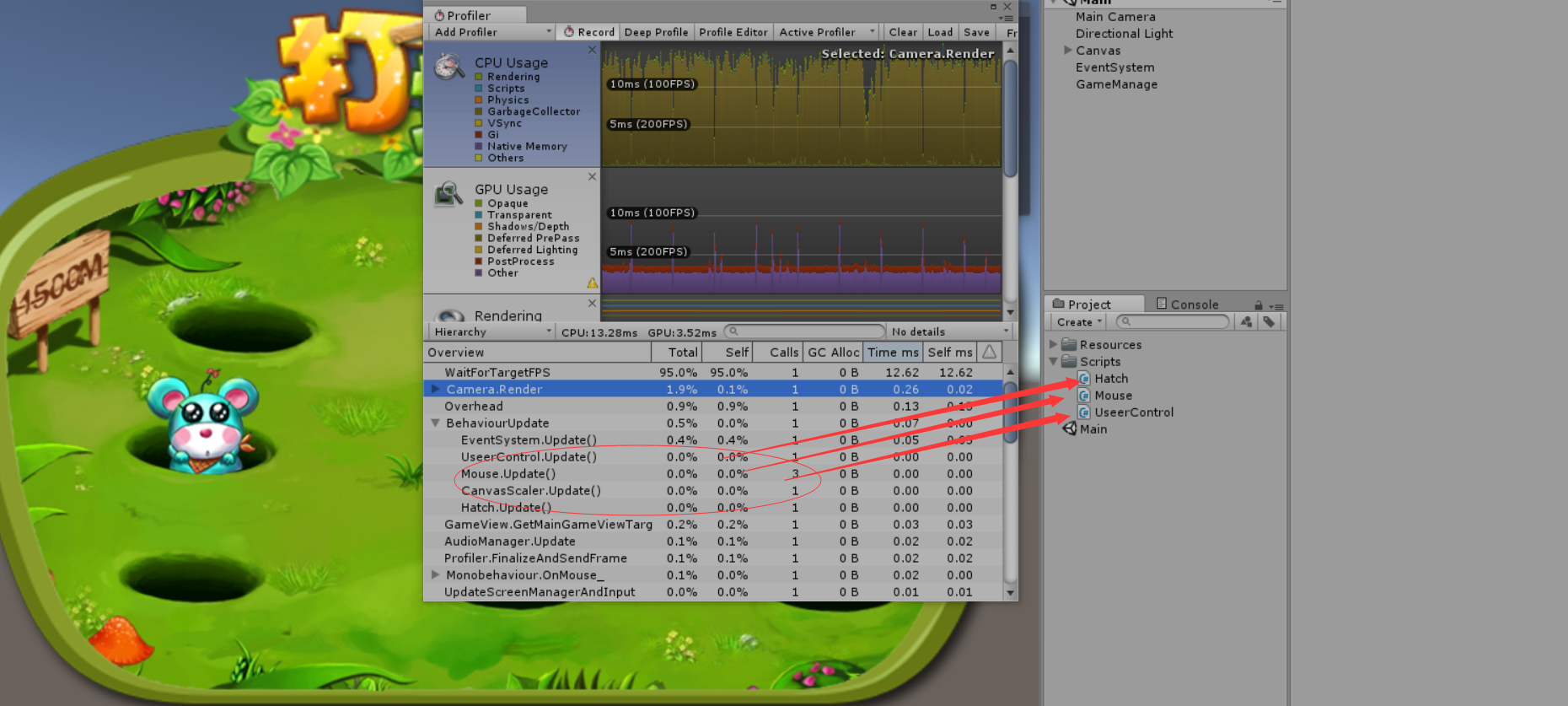 我们可以很清楚的看到我们CPU ,GPU的消耗情况。在这里我们来说下最下面的一些函数吧。这些函数就是Unity列举出来的性能消耗的主要函数。从这里你就能看到你的项目到底是哪里出现了问题了,然后就逐个问题逐个解决。这样就能达到优化的目的了。让你不再是无头苍蝇一样。不知所措。