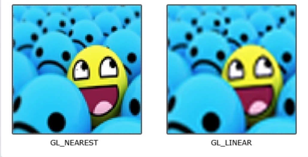 glTexParameteri(GL_TEXTURE_2D,GL_TEXTURE_MIN_FILTER,GL_LINEAR); //纹理缩小时,使⽤邻近过滤纹理过滤方式: