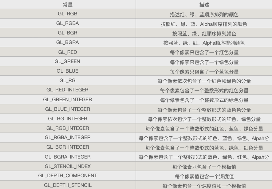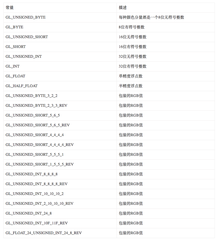 //type参数:解释参数pixels指向的数据,告诉OpenGL 使⽤缓存区中的什么 数据类型来存储颜⾊分量,像素数据的数据类型