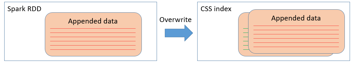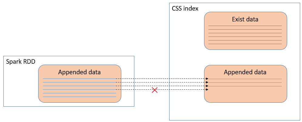 我们举一个简单的例子来说明一下,图1在SparkRDD中(这里假设是一个task),每一条蓝色的线代表100万条数据,那么10条蓝色的线表示了有1000万条数据准备写入到CSS(华为云搜索服务,内部为es)的某个index中。在写入过程中,系统发生了故障,导致只有一半(500万条)数据成功写入。