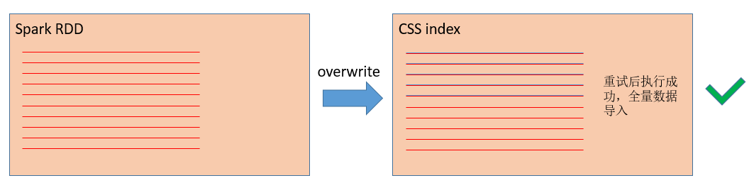 task是Spark执行任务的最小单元,如果task失败了,当前task需要整个重新执行。所以,当我们重新执行写入操作(图2),并最终重试成功之后(这次用红色来表示相同的1000万条数据),上一次失败留下的500万条数据依然存在(蓝色的线),变成脏数据。脏数据对数据计算的正确性带来了很严重的影响。因此,我们需要探索一种方法,能够实现Spark写入es数据的可靠性与正确性。