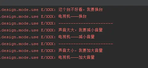我们来进行代码试。首先创建了电视机对象,再创建了具体的命令对象并将电视机对象传入,使得命令对象持有电视机对象的引用,最后是创建遥控器对象,并将命令对象传入,执行遥控器对象的doAction方法,发送命令,最后在电视机中执行操作。打印输出如下。
