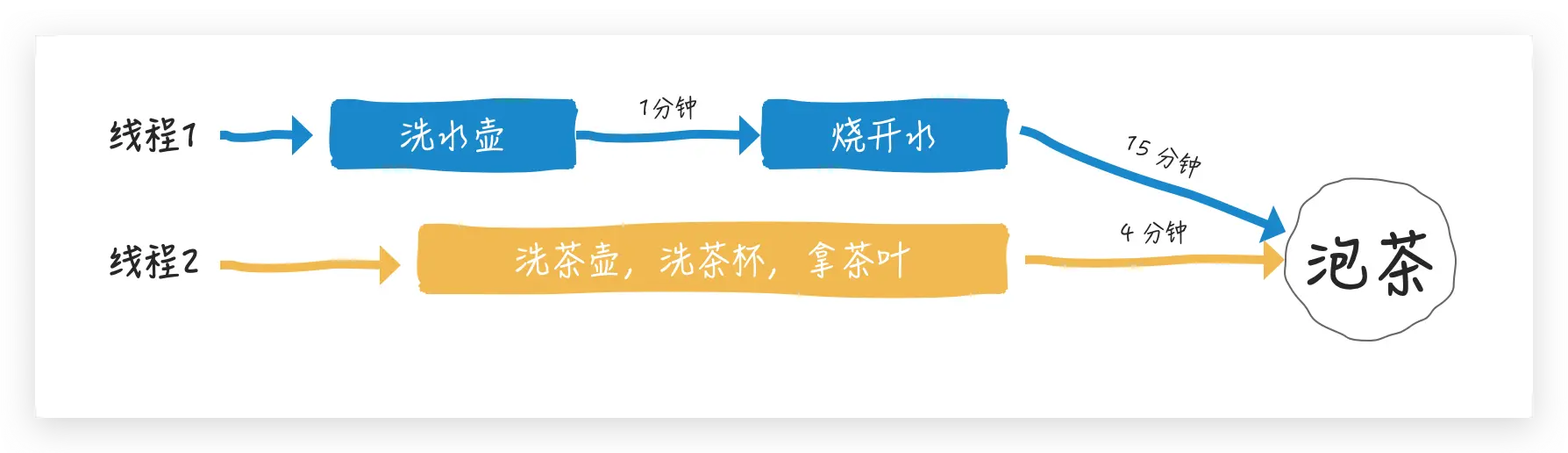 泡茶就是线程1 和 线程 2 的汇总/组合,也就是线程 1 和 线程 2 都完成之后才能到这个阶段(当然也存在线程1 或 线程 2 任意一个线程竣工就可以开启下一阶段的场景)