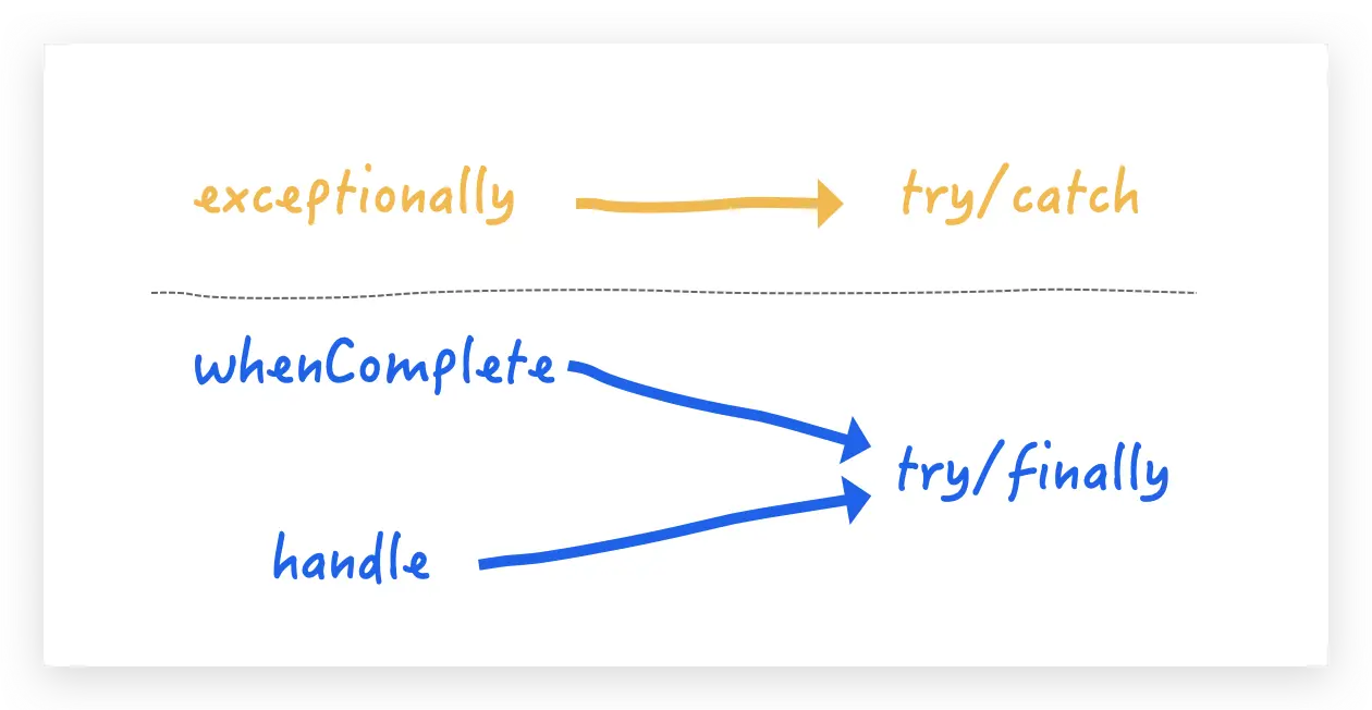 用多线程,良好的习惯是使用 try/finally 范式,handle 就可以起到 finally 的作用,对上述程序做一个小小的更改, handle 接受两个参数,一个是正常返回值,一个是异常