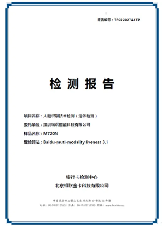 百度大脑人脸识别多模态活体检测算法持续更新,再次助力合作伙伴通过金融支付“增强级”认证。近日,百度AI 生态合作伙伴瑞识科技搭载百度大脑人脸识别多模态活体检测算法的3D结构光模组,正式通过国家金融IC卡安全检测中心-银行卡检测中心(以下简称BCTC)权威技术检测,在业内率先获得人脸识别技术活体检测“增强级”认证。