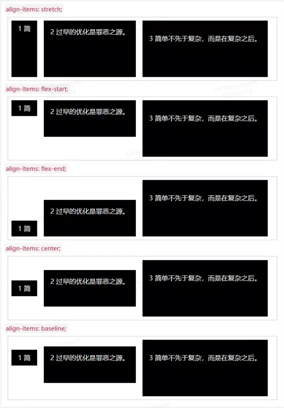 - flex-start(default): 从行首开始排列。每行第一个弹性元素与行首对齐,同时所有后续的弹性元素与前一个对齐。