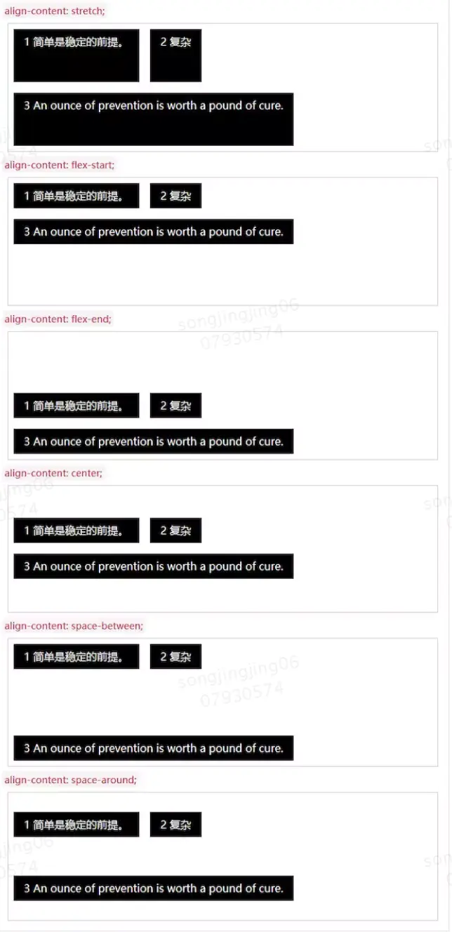- center: 伸缩元素向每行中点排列。每行第一个元素到行首的距离将与每行最后一个元素到行尾的距离相同。