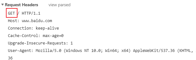 请求行包含了请求的方法,请求URI和HTTP版本,例如 GET /index.html HTTP/1.1 ,请求URI不一定会有,比如上面的百度主页就没有,但是你用百度搜索内容就会有,我在这里就不截图了。