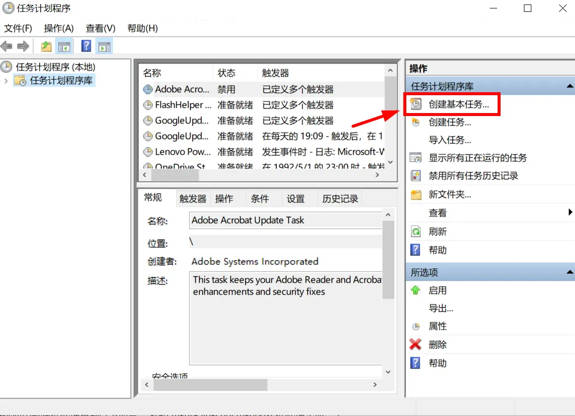 不管是在搜索框里面找或是咋弄,找到控制面板里一个叫做“计划任务”的功能。点击右侧面板的“创建基本任务”。