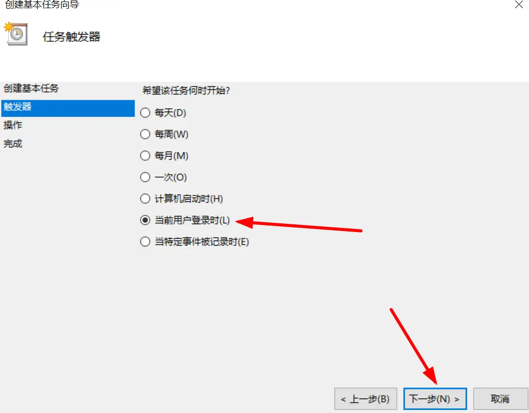 因为我的电脑是公司的,所以设置成只有自己登录了才执行,一般选择每天就可以了。点击下一步。