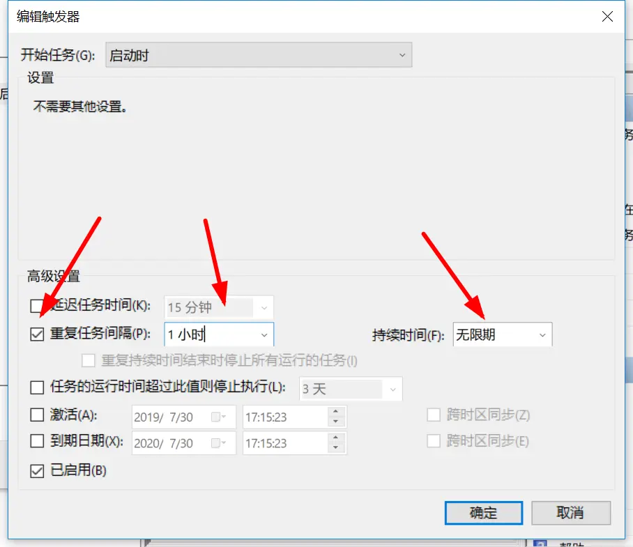 在打开的触发器编辑界面,勾选“重复任务间隔”,选择“一小时”,持续时间改为“无限期”。