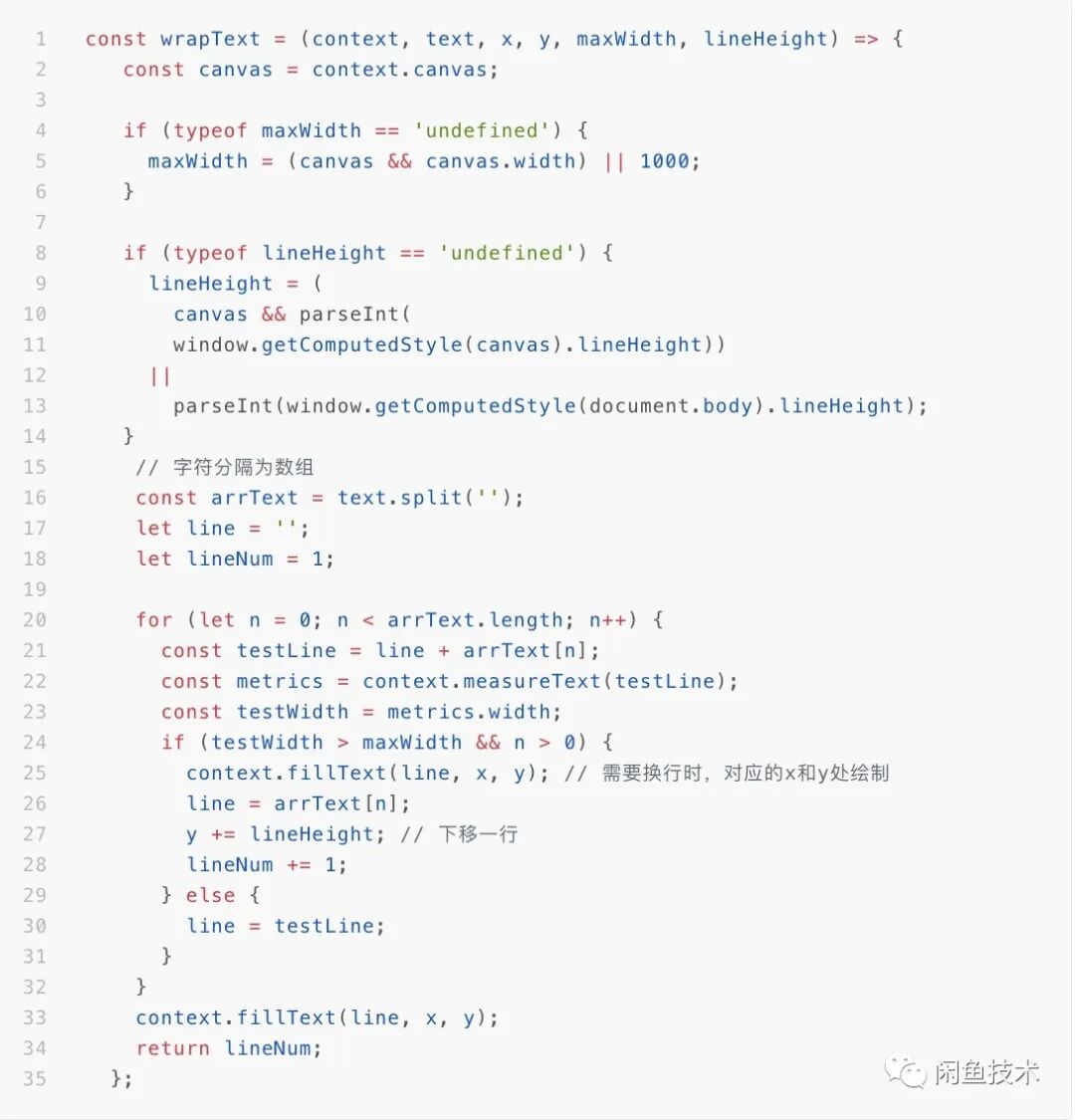 measureText获得当前文本宽度,每次添加一个字,比对此时文本宽度和行宽,超过时候绘制当前行,进行换行,y增加行高,重复这个过程。