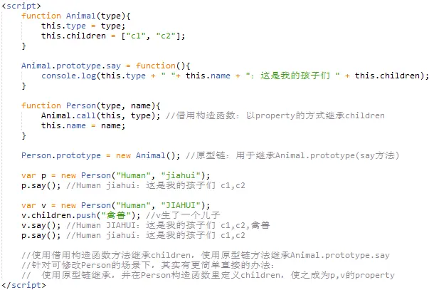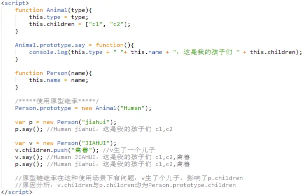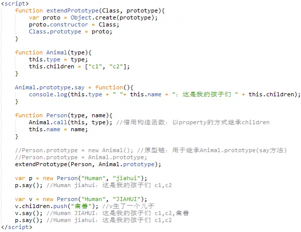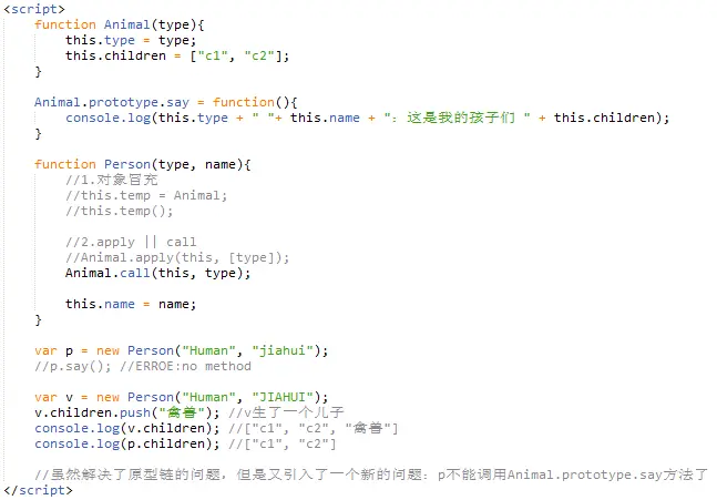空间上的冗余:在使用原型链的方法继承父类的原型属性(Animal.prototype)的同时,也在子类的原型(Person.prototype)中继承多了一份父类属性(Animal.property);具体来说:p与p.prototype中都保存了type,children,而p.prototype这一份是冗余的;
