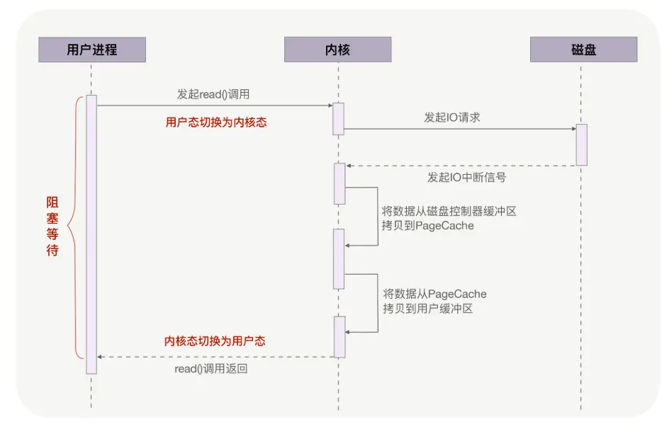回到开头的例子,当调用 read 方法读取文件时,实际上 read 方法会在磁盘寻址过程中阻塞等待,导致进程无法并发地处理其他任务,如下图所示:也就是在拉数据的过程中,一整个流程下来进程都是阻塞的意思。