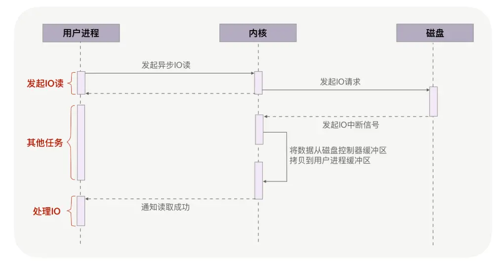 异步 IO(异步 IO 既可以处理网络 IO,也可以处理磁盘 IO,这里我们只关注磁盘 IO)可以解决阻塞问题。它把读操作分为两部分,前半部分向内核发起读请求,但不等待数据就位就立刻返回,此时进程可以并发地处理其他任务。当内核将磁盘中的数据拷贝到进程缓冲区后,进程将接收到内核的通知,再去处理数据,这是异步 IO 的后半部分。如下图所示: