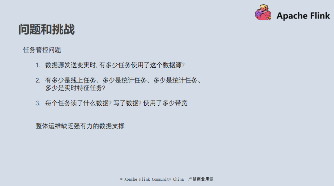 SQL 任务没有统一的元数据管理、上下游的数据源没有统一的登记、JAR 包任务没有统一的框架约束、平台方很难跟踪整个平台数据流的走向,我们不知道平台上运行的几百个任务分别是干什么的,哪些任务读了哪个数据源?输出了什么数据源?任务的种类是什么?是线上的,测试的,重要的还是不重要的。没有这些数据的支撑,导致整个运维工作非常局限。