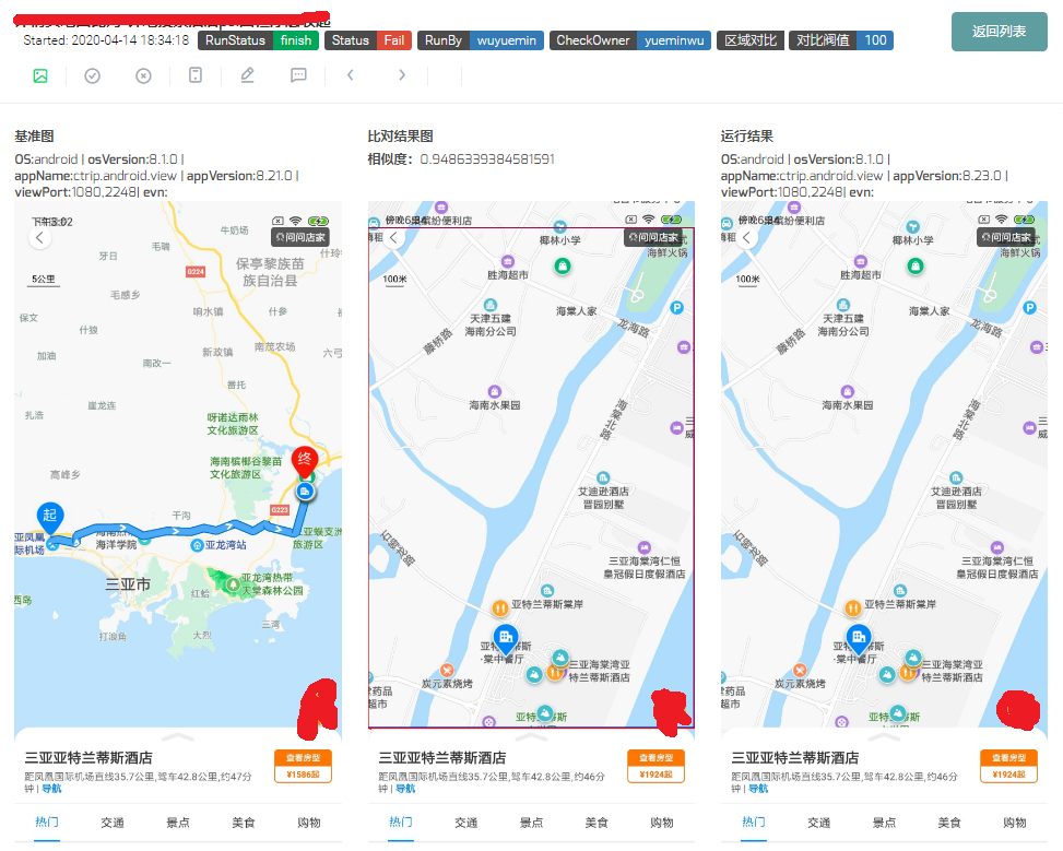 对于对比失败的测试用例,仍然需要测试或开发人员进行人工审查确认,相关人员可以在比较结果详情页中查看对比的详细结果。如果测试用例实际为通过,则将结果标记为通过,如需替换基准图,则亦可以选择将最新截图替换为基准图。如果测试结果实际为失败,则将结果标记为失败并记录缺陷。