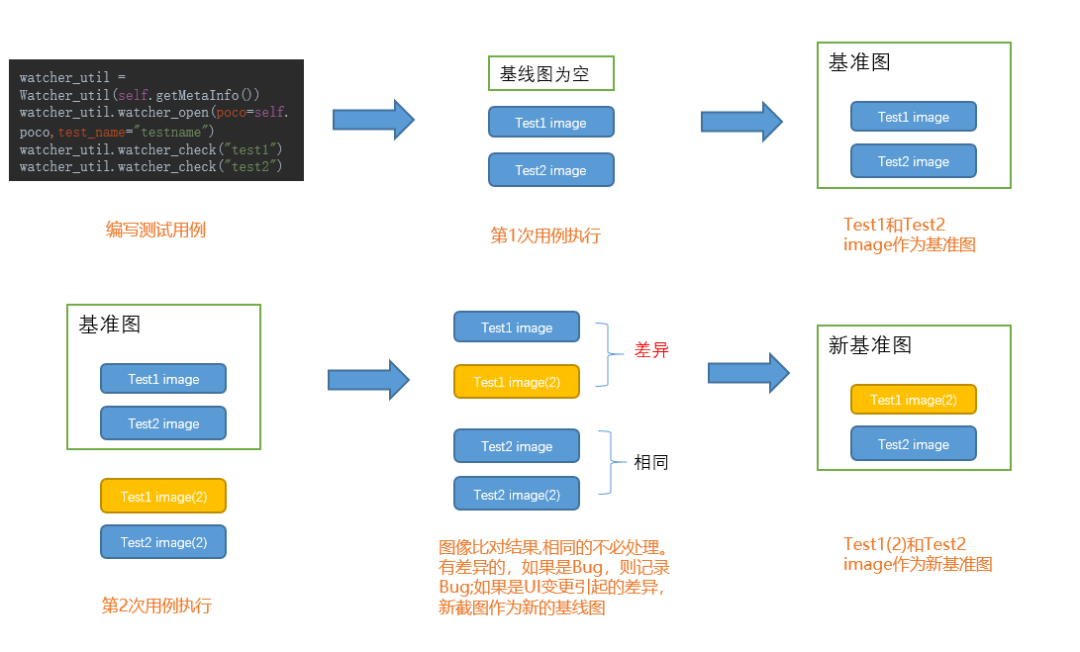 1)在UI自动化测试框架引入Watcher SDK,编写测试用例并在测试用例合适的位置调用Watcher的Check方法进行图像比对;