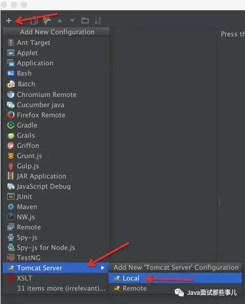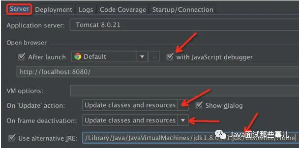 配置 Tomcat 的方法和直接上面说的直接调用配置方法一样, 同样需要注意的是 On 'Update' action 和 On frame deactivation 这两项目一定要选择 Update classes and resources, 唯一不同的是 VM options 这项不需要填, 放空就好 接下来直接启动项目, 一般选择后面那个 Debug 按钮