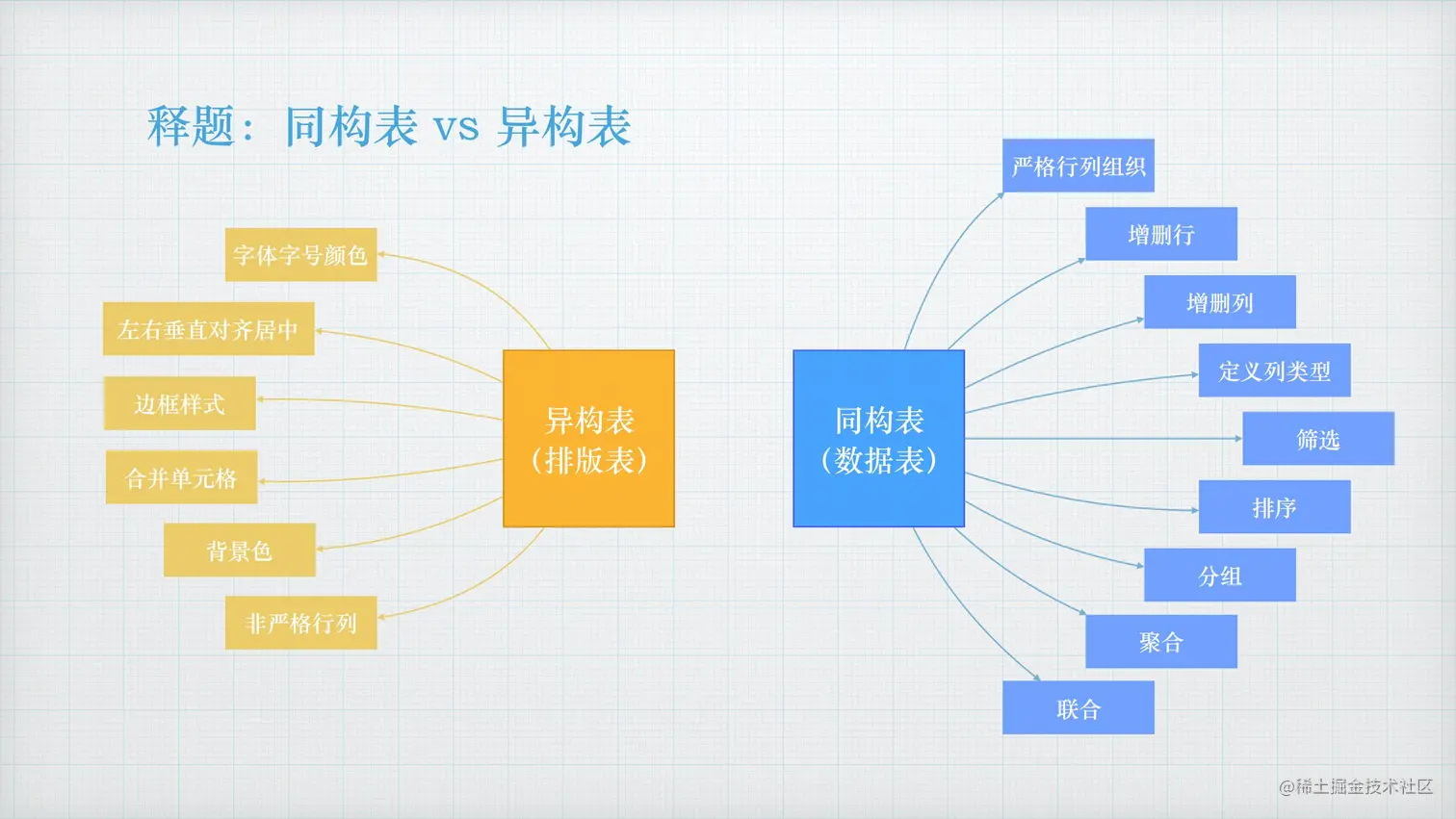 在排版表格中,数据其实是以单元格的形式去组织,没有很严格的行列概念,或者说,同一列中可能会出现不同类型的值,比如上面一个单元格内是文本,而下面一个单元格是数字。这是,表格内的数据其实并不遵循相同的结构,我们又称 Excel 这种排版表格为异构表。