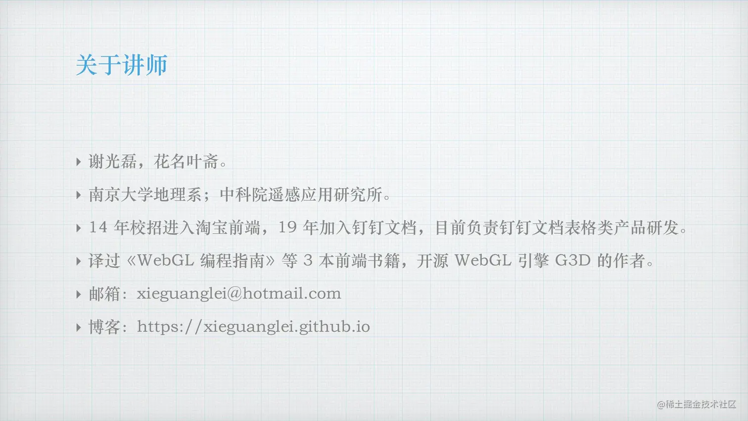 先简单地做个自我介绍吧。我叫谢光磊,花名叶斋。毕业于南京大学地理系,硕士在中科院遥感所。我是在 14 年校招进入淘宝前端,19 年的时候转到钉钉文档团队,目前负责钉钉文档表格类产品的研发。熟悉我的人,都说我身上有一个标签那就是 WebGL,其实我对 WebGL 很感兴趣,曾经翻译过《WebGL 编程指南》这本书,然后也是 WebGL 3D 渲染引擎 G3D 的作者。我的邮箱,和我的博客都在下面,这次分享之后,如果大家想再与我进行更进一步的交流,欢迎给我发邮件。