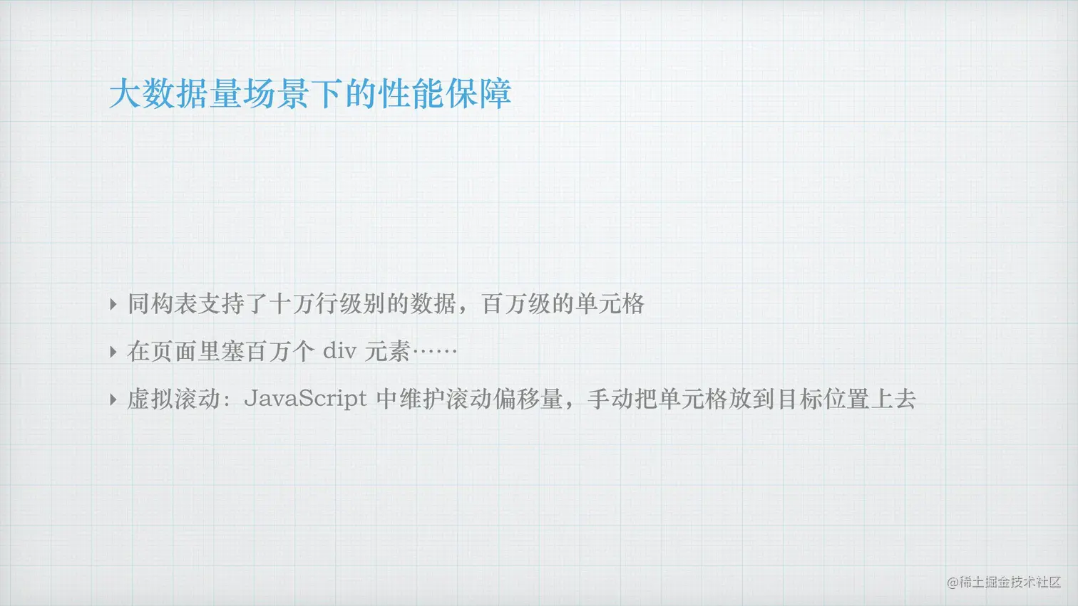 计算性能和渲染性能。同构表支持了 10 万行这个级别的数据量。在这个数据量级下,同构表只有在初始化加载数据的过程中需要等待一到两秒,中间的各种操作是非常流畅的,这是怎么做到的呢?