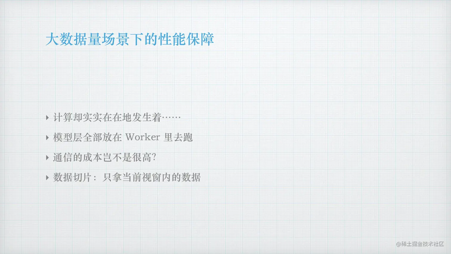 解决的方案很粗暴:我们把整个 Model 层放到了 Worker 里面跑,让它自己在里面算,卡不到外面就好了。这时肯定有同学会问,这样 Worker 内外通讯的成本,10 万条数据,每有一点改动,都要传一下,岂不会很高?