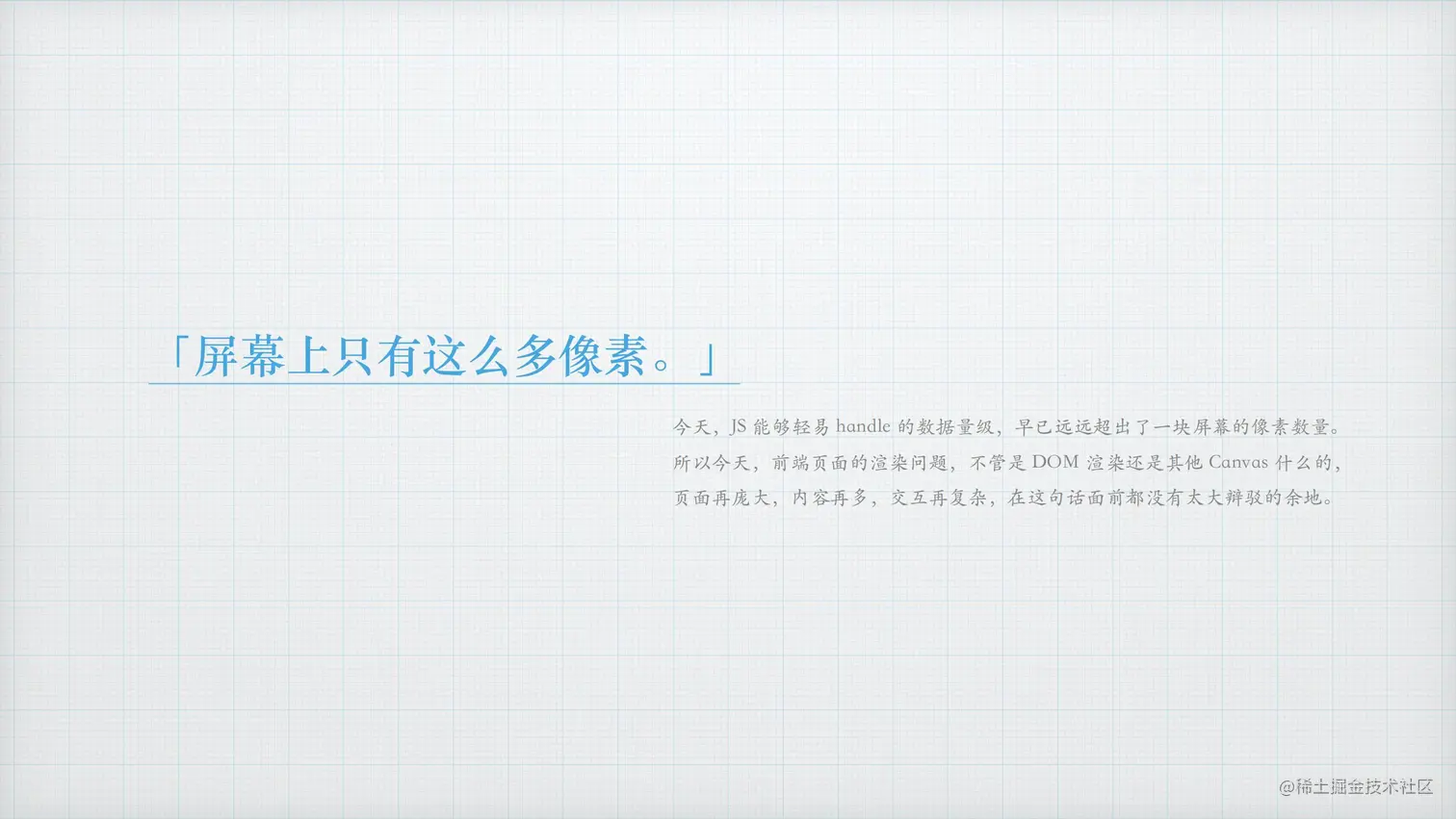 我其实挺喜欢一句话的,就是「屏幕上只有这么多像素」。今天,JS 能够轻易 handle 的数据的量级,早已远远超出了一块屏幕的像素数量。所以前端页面的渲染问题,不管是 DOM 渲染还是其他的什么,你的页面再庞大,内容再多,交互再复杂,在这句话面前都没有太大的辩驳的余地。