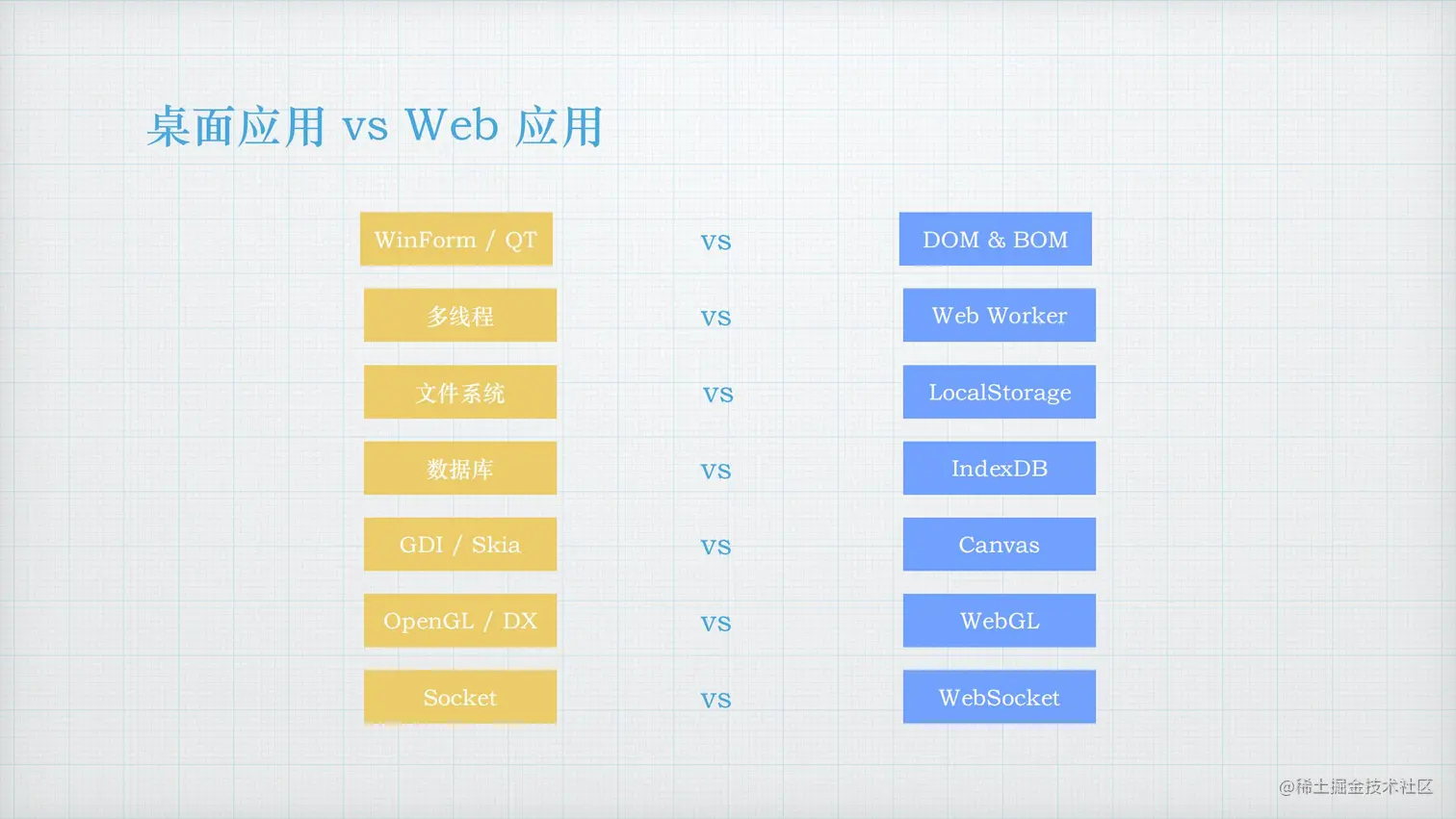 但是我们的工具也多,桌面应用有多线程,我们有 Worker,桌面应用有 QT / WinForm,我们有 DOM,桌面应用有 GDI / Skia,我们有 Canvas,桌面有 Socket,我们有 WebSocket,桌面有 FileSystem,我们有 localStorage …… 不胜枚举。对每个功能,其实浏览器已经给你准备好了一个弱化版的代替品,弱归弱,但是能用啊。