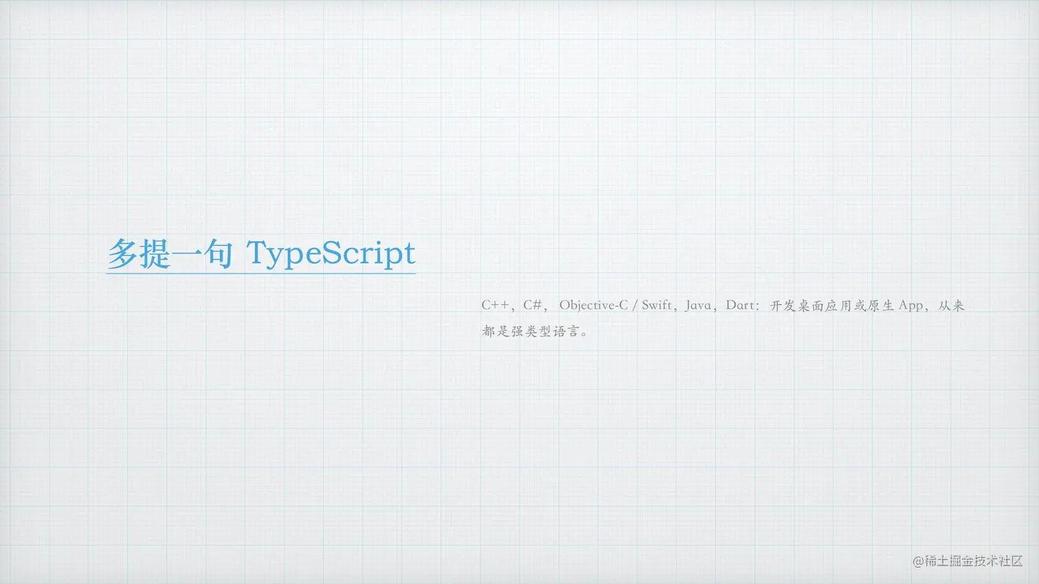 说到这里我需要提一下 TypeScript。开发桌面应用或 native app 的语言,从 C++ 到 C# 到 OC / Swift 到 Java 甚至 Flutter 的 Dart,从来都是强类型语言(也许是动态语言,但一定是强类型语言)。但是前端开发手里只有 JavaScript,直到 TypeScript 横空出世。有一点我非常确定,就是对复杂的桌面级前端应用来说,TypeScript 在未来三年内,几乎唯一的选择。